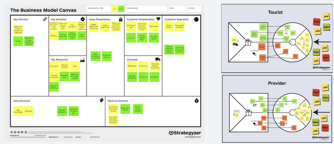 TALKING ABOUT BUSINESS VALUEIn order to illustrate the value of the idea for the tourists and the tourism providers, the main customers of the client, a business model was developed. Also the team created 2 value propostion canvases to illustrate how the concepts can bring value to the client's customers. The prototypes can tell a story, however the best way to ground the project was through showing how the business might work.