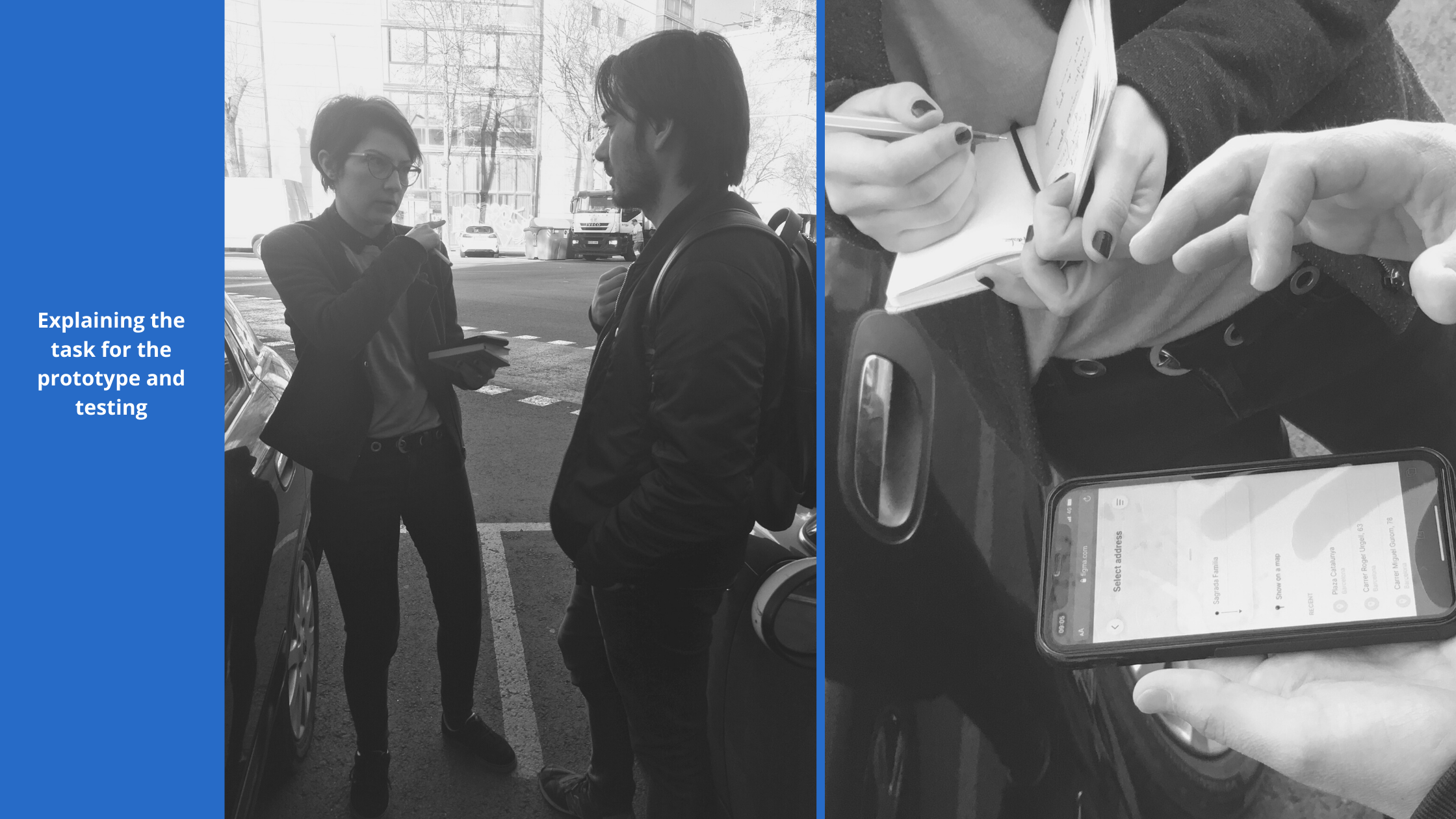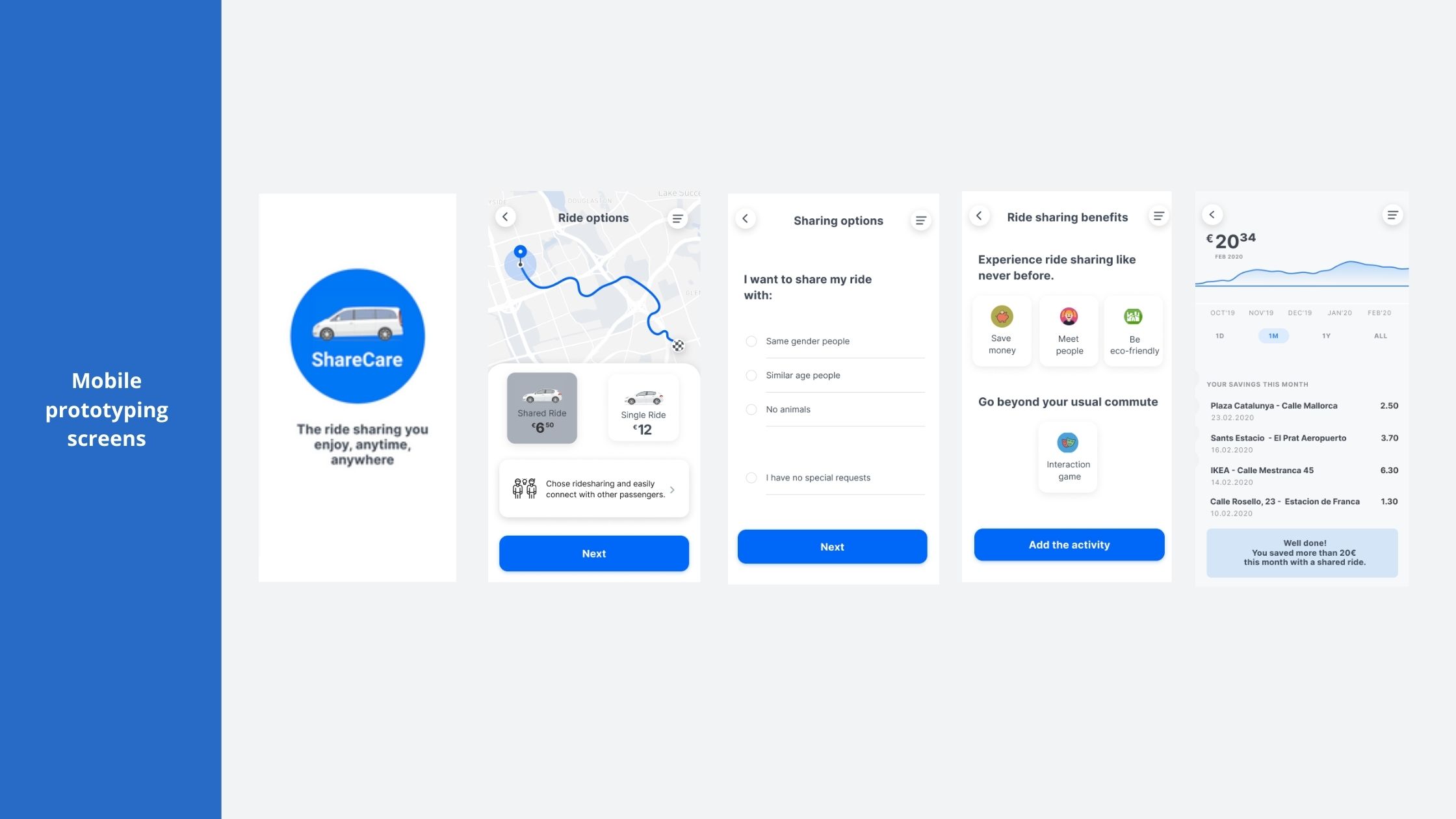 After several meetings with the client, the final agreed goal of the project was to design a way to help all mobility users easily share a ride with strangers in order for them to feel more secure, at easy and save money. The team focused on testing various hypothesis related to the topic. In order to test the experience, the team used diffrent types of prototypes: