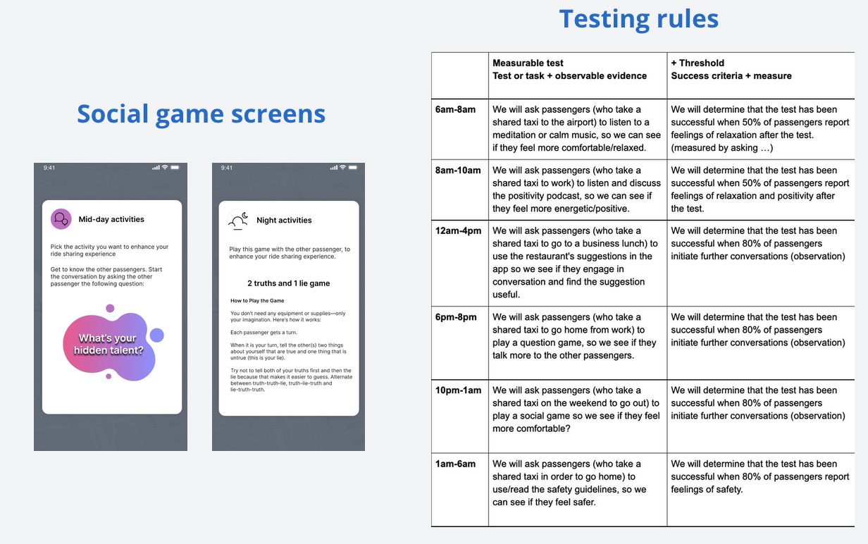 For the design of the prototype, Figma was used to design the app. After testing an initial digital prototype in a shared car setting, the team observed that people feel uncomfortable during the ride with strangers. Based on these observations, some social activities during the ride were introduced. They were based on different times of day.