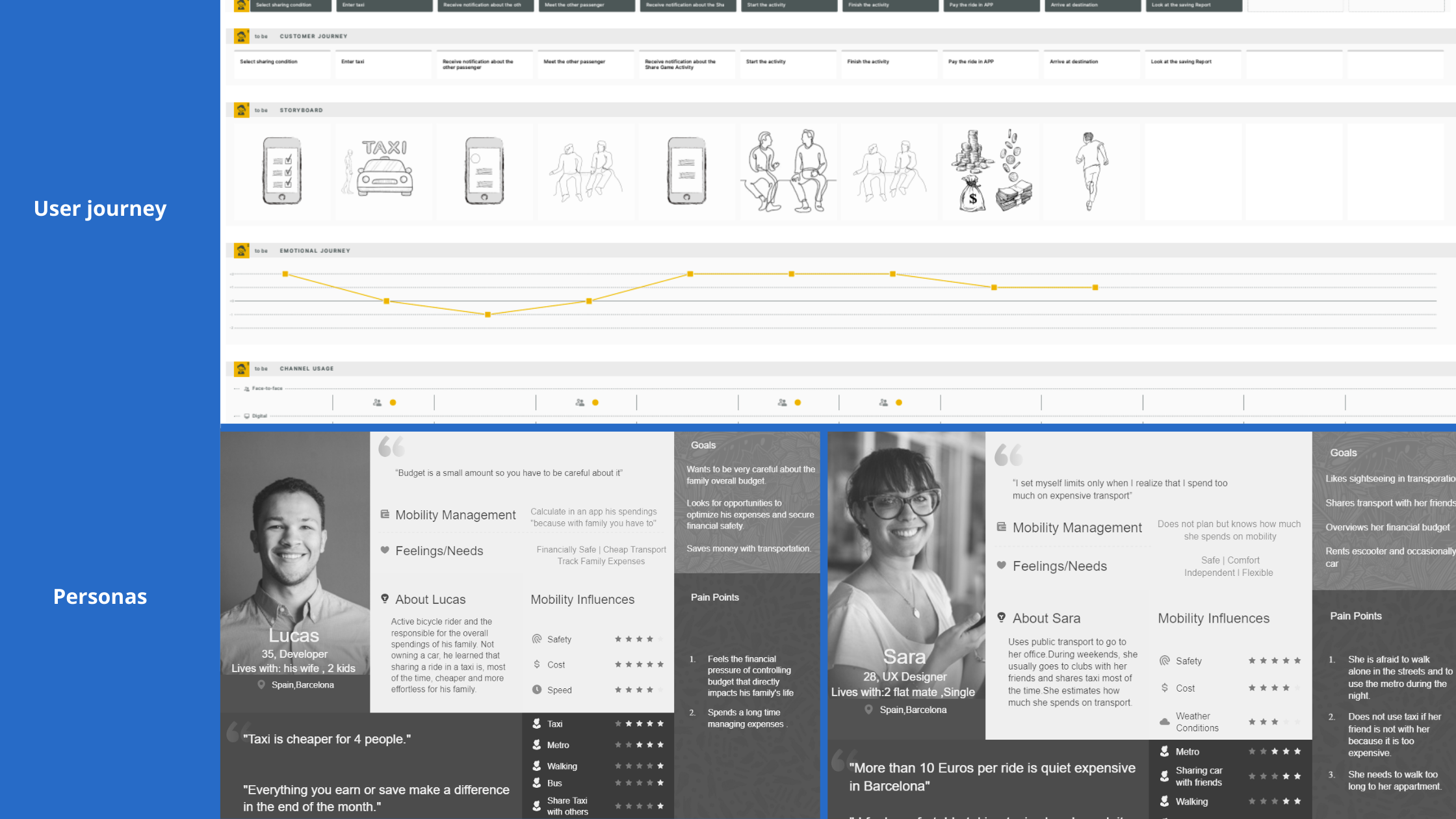 In order to investigate the mobility challenge, the team had to understand the behaviors, needs and motivations of local mobility users. After an initial research phase, the team focused on the behavior of sharing a ride and splitting the bill after. As sharing a ride was not common in Catalonia - a region in Spain- due to cultural factors, company's policies and the market's unreadiness, the team wanted to know if ride sharing would be an interest for people and if so, how to design an experience to suit their mobility and financial needs.