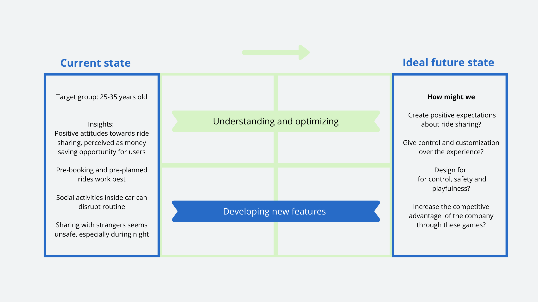 The transformation that this project brought was from a previous state of unreadiness of market to embrace ridesharing to a current state of exploration where games in the car can improve experiences and to future directions of where the mobility provider can further develop. Some interesting provocations that the team launched were, for example, how might we create positive expectations about ride sharing? More research is needed to investigate these potential future directions and concepts.