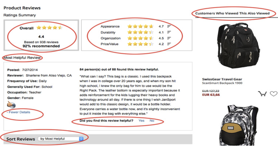 Ebags uses social proof in a very comprehensive way. We can see here many beneficial tips, like overall ratings, “most helpful review”, details of the person who left the review (with the option to see more or fewer details), the option to sort reviews, the possibility to take action yourself with “Did you find this review helpful?”. Also they are using other social proof tactics like “customers ..also viewed”. These tricks among others like “most wanted”, “most popular” are powerful converters because they are showing you what others are doing in real time, thus appealing to your social sense of belonging.