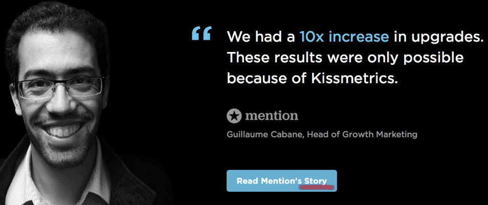 Include a story about the product or service. This appeals directly to our emotional brain, giving us a glimpse into the person's mind and expectations. Kissmetric is doing a great job here, combining a testimonial, plus a picture, plus the story.