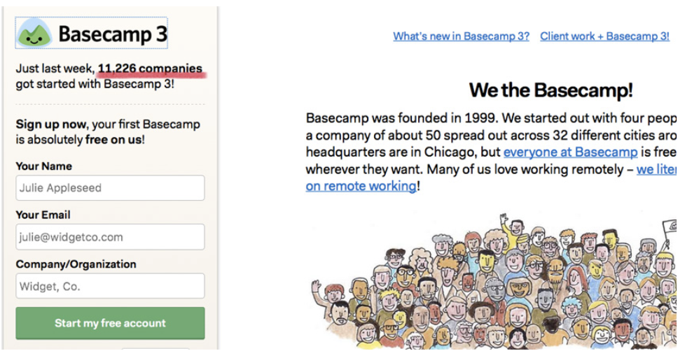 If possible, couple the social proof with a call-to-action button. In that way the users after seeing how "popular" or used your product is, will be more inclined to take action (as our Basecamp example above).